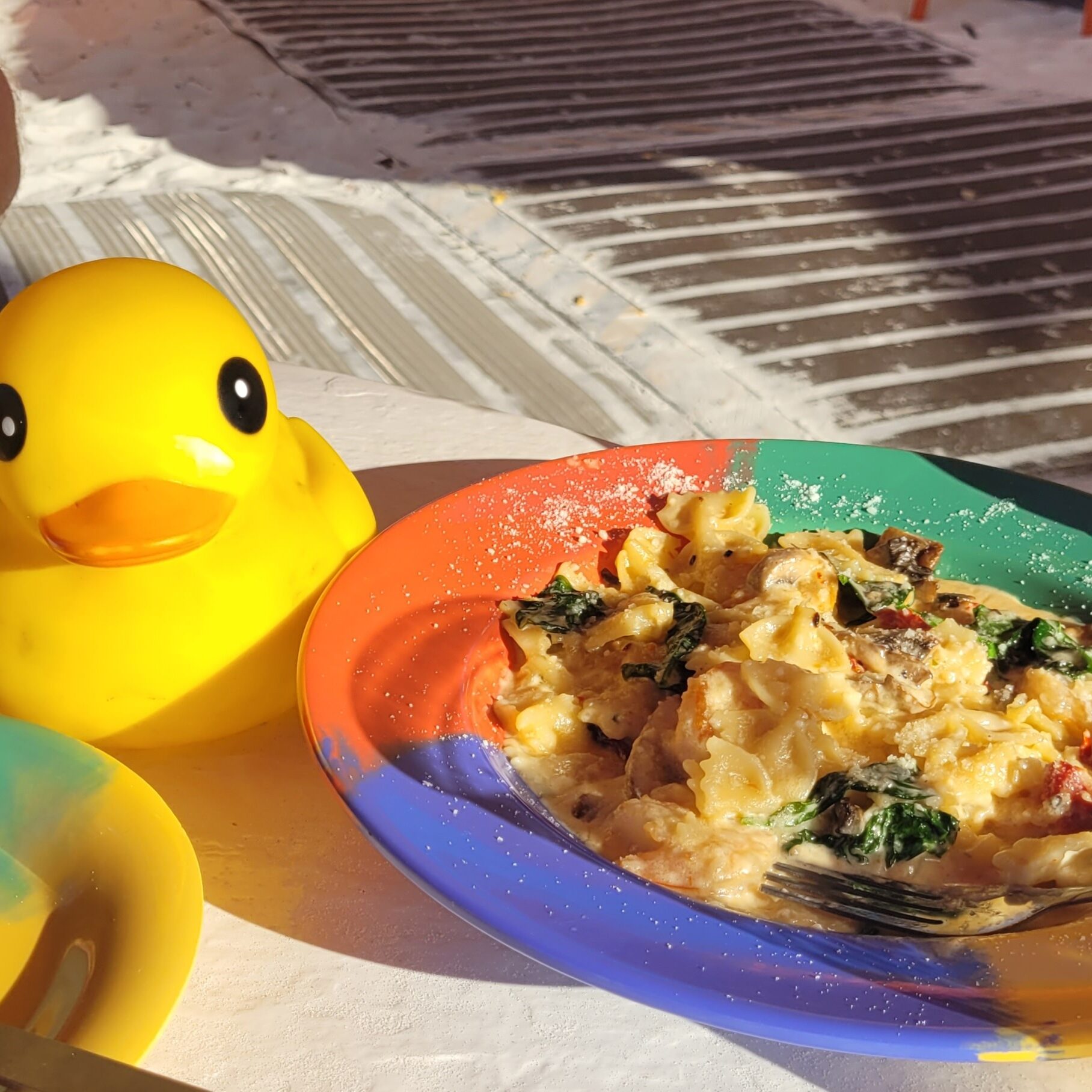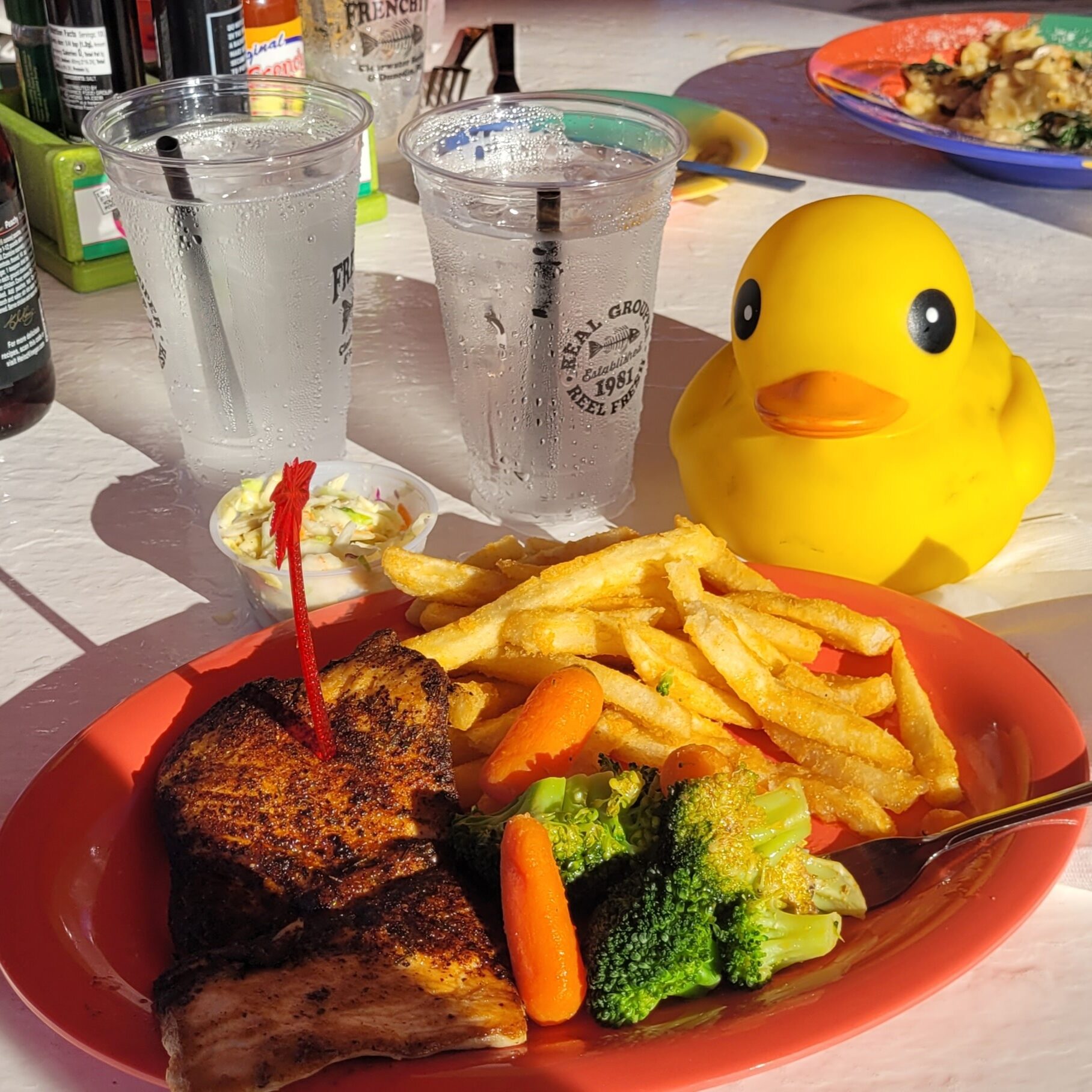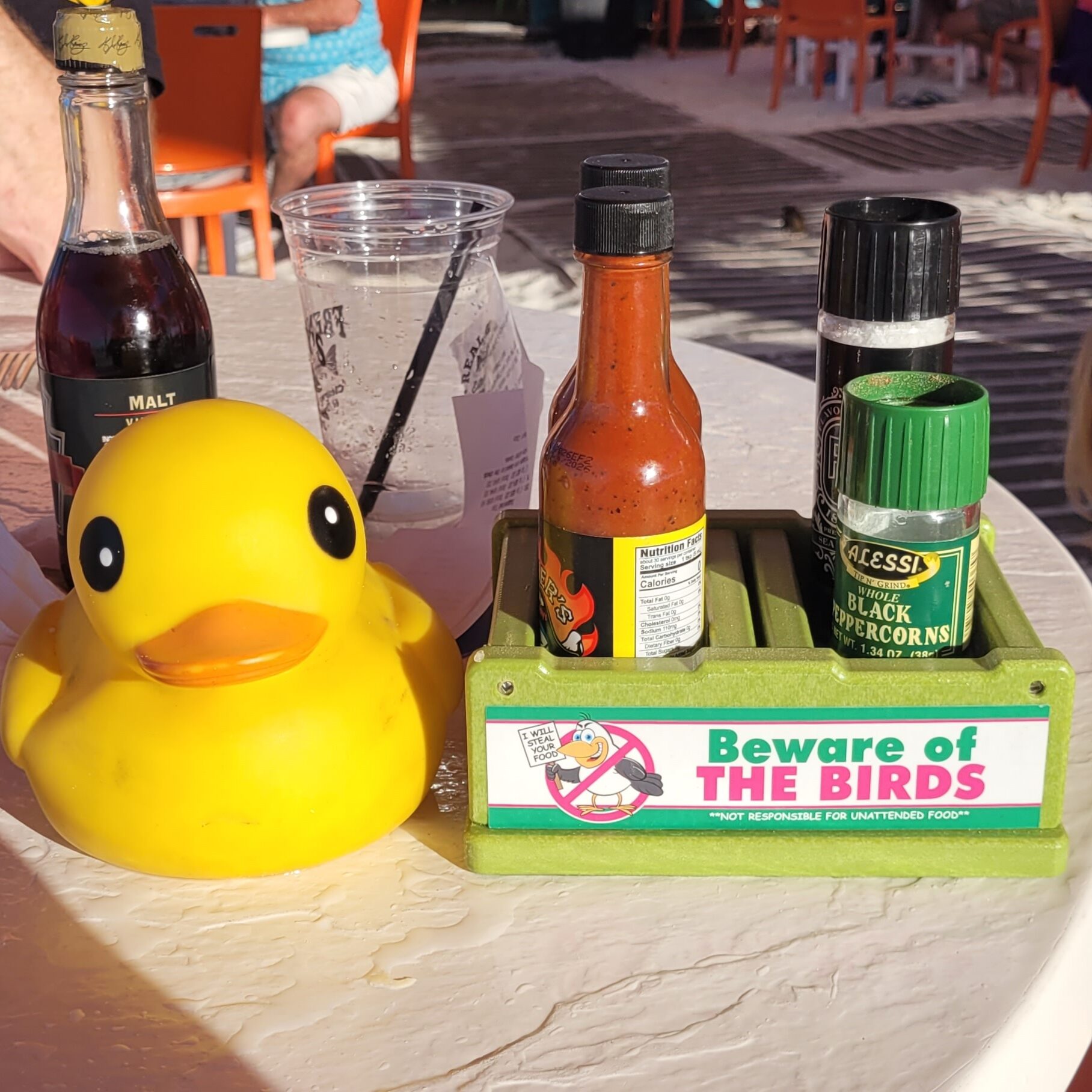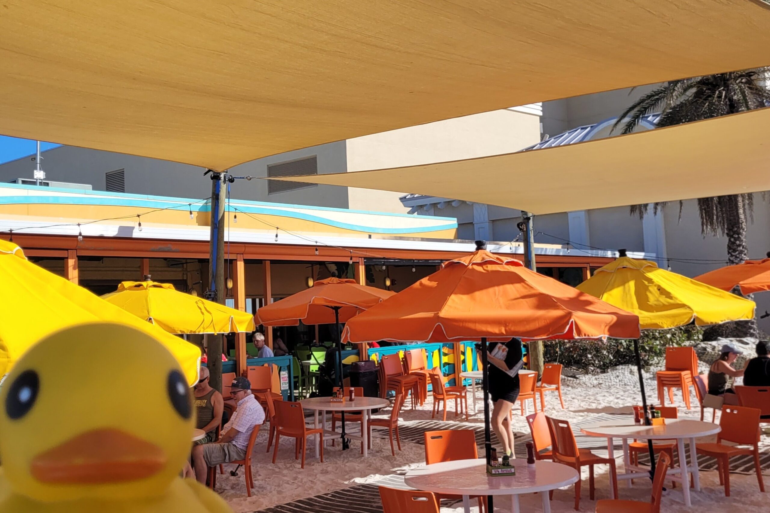 The warm sunshine felt terrific, and the sand tickled my webbed feet as we ate. Talk about dining al fresco!